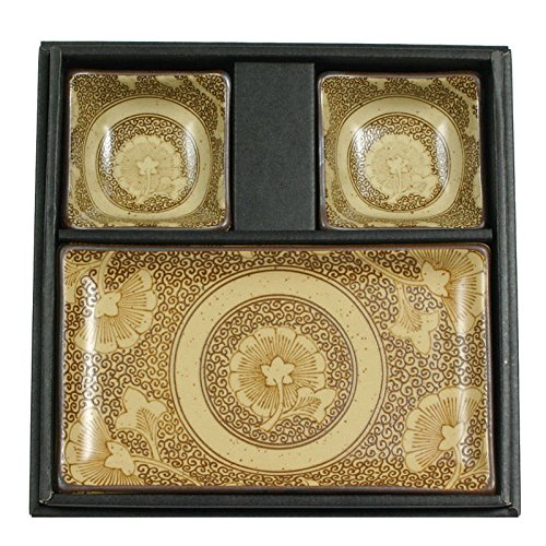Studio : MIYA Publisher : MIYA Product Description Miya Japanese Sushi Tray Set for Two with Chopsticks, Sepia Gingko;Presented in a black gift box for easy gift-giving, this popular Sushi For Two set is perfect for anyone who appreciates great food. Sushi set includes two 8.75" x 5" rectangular plates, two 3.5" square sauce dishes and two pairs of chopsticks in a black gift box. Microwave, dishwasher safe (except for chopsticks). Great also for holding votive candles or soap in sauce dishes on top of a tray rectangular plate. The perfect housewarming or congratulatory present for your favorite couple. 0
