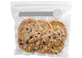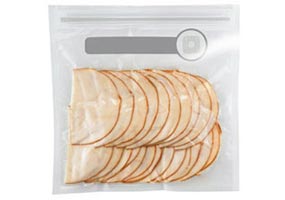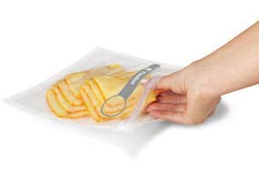 To use, simply add food to the bag--its expandable bottom helps ensure easy filling. Once filled, zip the bag completely shut using the reinforced double-track zipper. Next, place a handheld vacuum sealer (sold separately) over the valve marked within the circle on the bag, and press the button. In one smooth move, the system removes all the air out of the bag, creating a stay-fresh, air-tight seal.