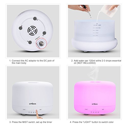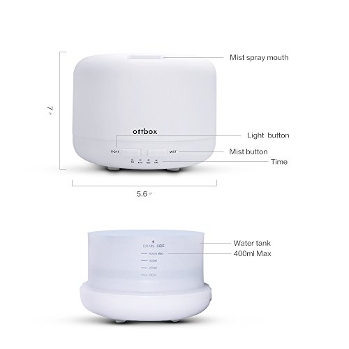 Larger Capacity and Timer Setting: This aroma humidifier can hold up 400ml water and run for up 8 hours to 12 hours, and has 4 timer 60/ 120/ 180 minutes/ Continuous modes.