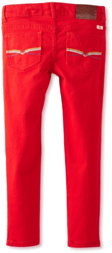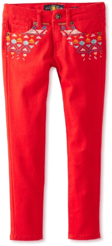 This lucky brand stretch twill pant comes in a rich, salsa red color and features multi, color embroidery by the pockets