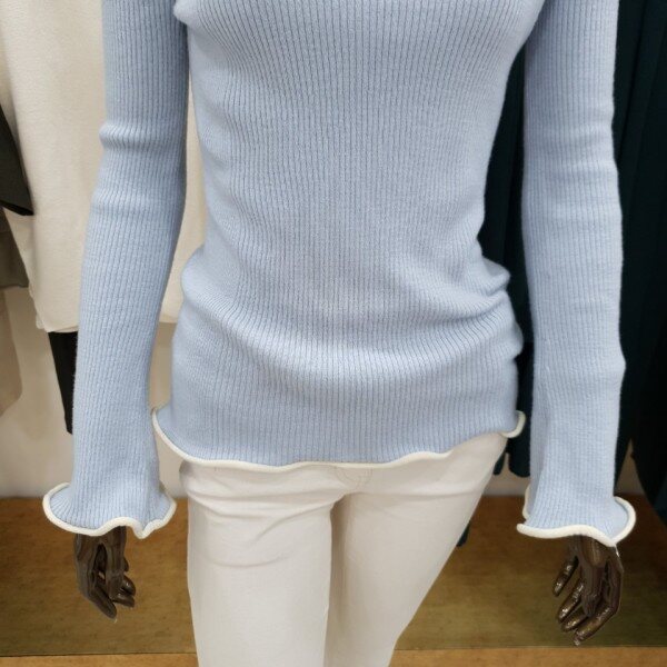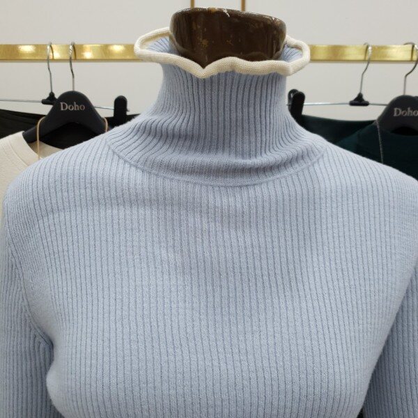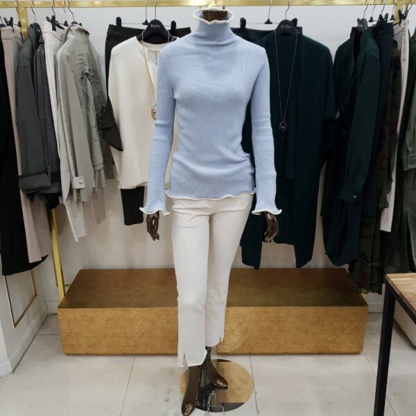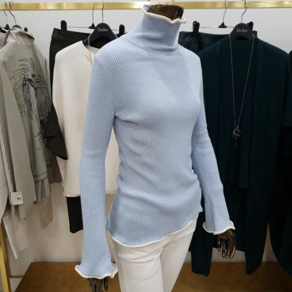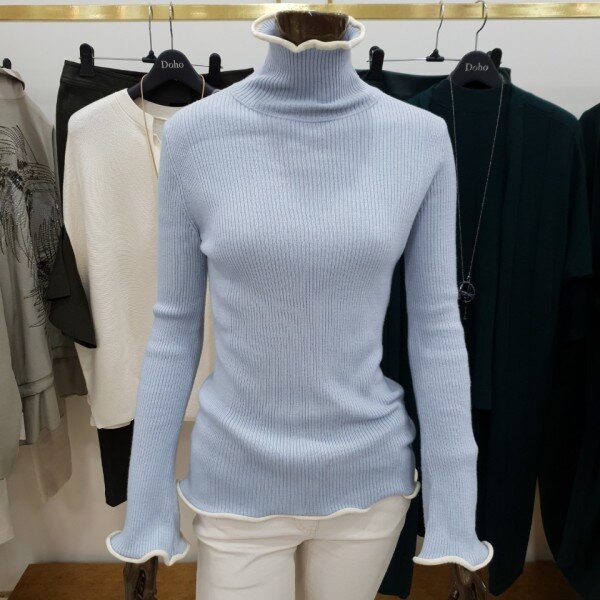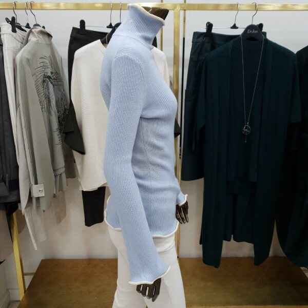 물결 모양 곡선 실루엣 디테일이 특징인 니트 입니다