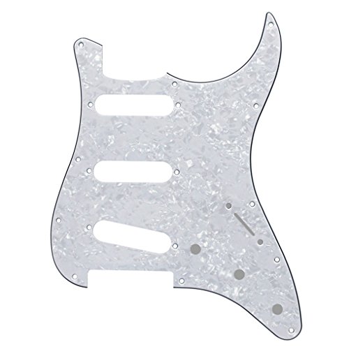 Studio : iknmusic Publisher : iknmusic Product Description Feature: * For US Modern Fender Strat Stratocaster style guitar or similar.* With pure aluminum foil shield on the backside, not the common aluminum-foil paper on the market, better shielding property and anti-interference.* All materials are environmentally friendly, thermostability, no smell. Multi-layer plates are pressed under high temperature and pressures, to make them close integration between each layer, will not appear curly, deformation, or separation of different layers.* Excellent product process ensure the edge of the smooth and structured.Two layers of protective films on the front of pickguards, anti-scratch to protect the guitar.Specification:* Style: SSS(single/single/single coil) style pickguard; 11 screws holes in the side of pickguard.* Material: 4Ply Pearl Plate and PVC* With pure aluminum foil shield.* Color: White Pearl Color* With protective film on the surface, while using please split it off.* Note:Item's color might be different from the picture because of the aberration.Package Includes:1 x guitar pickguard 0
