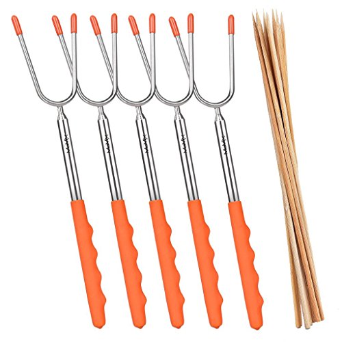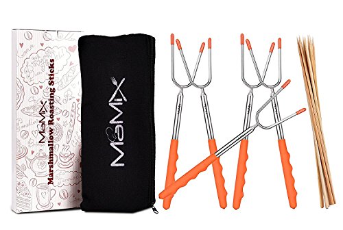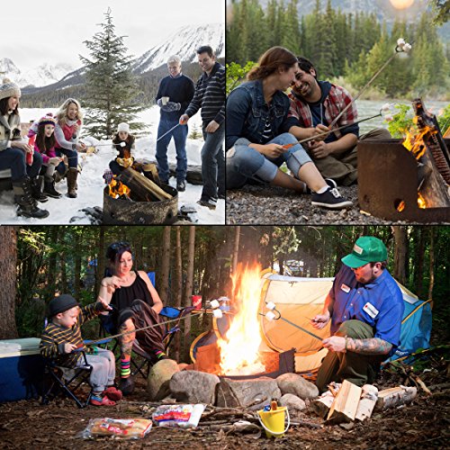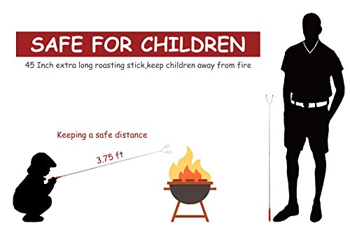 - [Safe & Durable]- IMPROVED Smores Sticks,Argon Arc Welding of the connector,the marshmallow roasting poker ends are steady,no need to worry it fall off or broken after used many times.304 stainless steel marshmallow skewers, Non-Toxic Heat-Treated FDA Approved,no rusting & safe roasting.Telescoping marshmallow sticks Two prongs to prevent marshmallow from spinning on stick when melting.