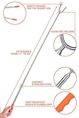- [Extendable & Safe for Childeren]- Expanding from 11" to 45" telescoping hot dog forks keep you and kids stay away from campfire, patio fire pit,grill.These Extra Long roasting sticks have comfortable rubber handle with finger indents gives you a firm, steady grip and anti-hot for your hand.