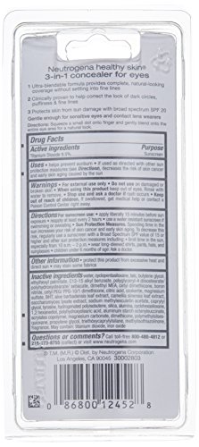 Look fresher and brighter with Neutrogena Healthy Skin 3-in-1 Concealer for Eyes Broad Spectrum SPF 20. This easily blendable concealer for the eye area provides natural-looking coverage without settling into fine lines. Made with soothing aloe and green tea, the formula is also clinically proven to instantly begin correcting the look of dark circles, puffiness, and fine lines. With broad spectrum SPF 20, it also helps protect against sun damage. This dermatologist-developed formula is gentle enough for sensitive eyes and contact lens wearers.Feature