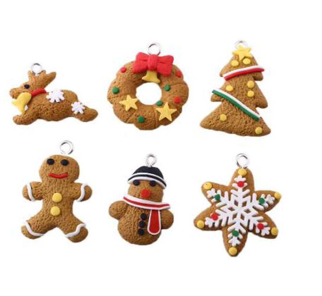 サイズ:約2.5〜4cm 素材:ポリマークレイ ひも付きです。(結んでません) 本物のクッキーのようにおいしそうで可愛いです。 トナカイ・リース・ツリー・クッキーマン・雪だるま・雪の結晶の6種セットです。 家庭用の卓上ツリーにピッタリです。