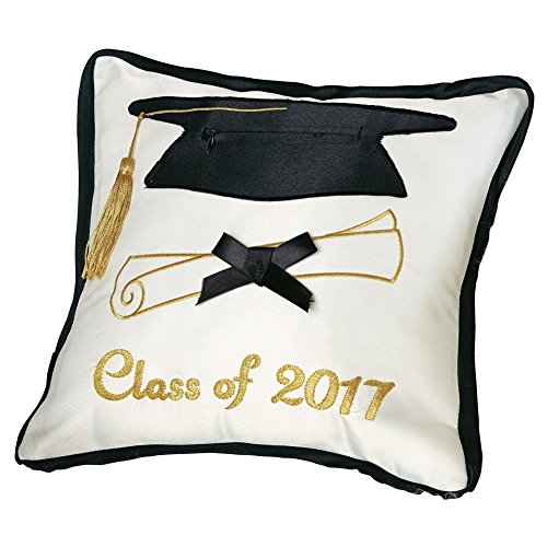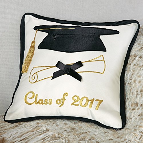 Plush pillow features a mortarboard with a gold tassel, an embroidered diploma with a black bow, and "Class of 2017" in gold embroidered script
