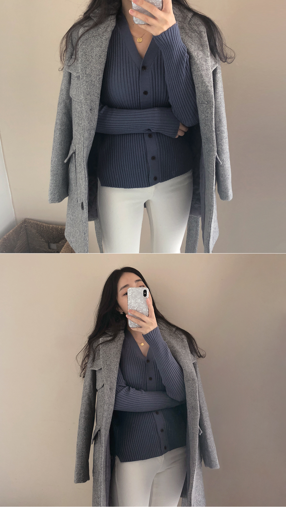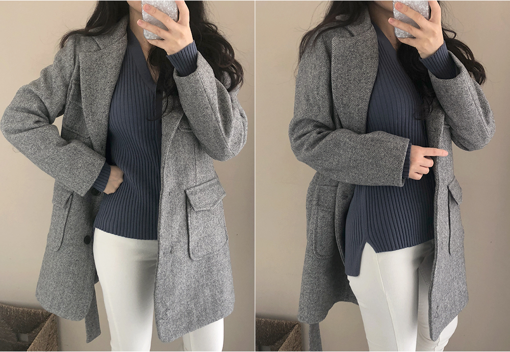 브이넥라인으로 슬림한 얼굴, 쇄골라인을 돋보여드리구요