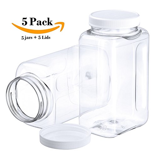 Pack of 5 - 22 Oz Large Clear Empty Plastic Storage Jars with Lids - Square Food Grade Container with Easy Grip Handles - Multi Purpose Jar BPA Free