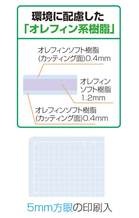 切り目が目立ちにくい素材を使用した、5mm方眼線入りの便利なカッティングマットです。