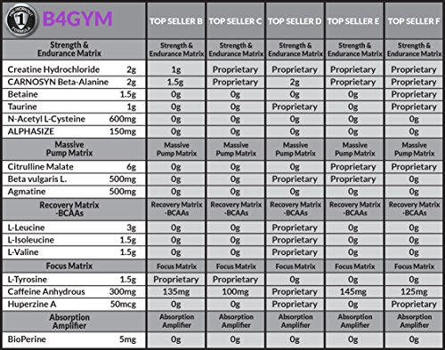 -. Feature : If you desire an advanced pre workout that balances great taste with extreme performance utilizing licensed materials to ensure purity, quality and consistency without the mystery of proP.R.Ietary blends then checkout B4GYM. / 7 g Massive Pump Matrix Includes 500 mg of Agmatine / Serving / Recovery Matrix Includes 6 g of BCAA's 2-1-1 ratio plus Absorption Amplifier Bioperene / 7.25 g Strength & Endurance Matrix with Zero Crash & Laser Focus Matrix that also Includes 1.5 g of L-Tyrosine 300 mg of Caffeine Anhydrous + 50 mcg of Huperzine A / VIZINX B4GYM IS MADE IN THE USA and is backed by our 100% Money Back Guarantee, we are always excited to meet and exceed our customer's expectations.