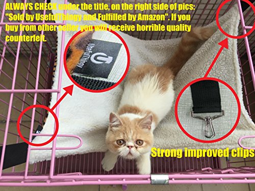 Pet Hammock by UsefulThingy Give your furry friends comfy rest place they deserve! If you are a cat lover, give this beautiful, comfortable product a try. Advantages of Pet hammock by UsefulThingy: ? Beautiful design - inspired by lynx fur; white, soft comfortable fleece on other side ? Wide usage - Perfect for all small pets. Ideal for cats, kittens, ferrets, rabbits(bunnies), pet rats, chinchillas, pet mice, hamsters or small dogs. ? New go to location - Your animal might feel more secure during sleep. ? Quality durable material - new improved clips now (April 2016), extra wide, extra strong holding straps supporting up to 20 lbs ? Easy to attach - simply attach the metal clips to the cage. Another option is to attach it under the bed or some chairs(please check under the bed/chair construction if its possible before purchase). Save precious floor space. ? Easy to clean - we recommend hand washing with soap. Also possible to wash in washing machine, but you need to protect metal clips from contact with water ? Fulfilled by Amazon - fast reliable delivery, unlike many direct chinese sellers (be warned of their low quality!!!) taking 1-2 months. Always make sure you see this under the title (on the right side of pictures, above bullet points): Sold by UsefulThingy and Fulfilled by Amazon. ? 100% Money back guarantee for 30 days - if you are not satisfied with our product, you can return it for 30 days for no hassle money return ? Excellent customer service - we are here to answer all your questions. Our goal is 100% happy customers Buy yours today and spoil your pet. We sell out fast! 0 |