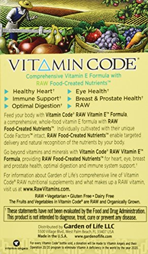 -. Binding : Health and Beauty -. Brand : Garden of Life -. Label : garden of life -. Manufacturer : garden of life -. ProductGroup : Health and Beauty -. ProductTypeName : HEALTH_PERSONAL_CARE -. Publisher : garden of life -. Studio : garden of life -. Title : Garden of Life Vitamin Code - Raw Vitamin E