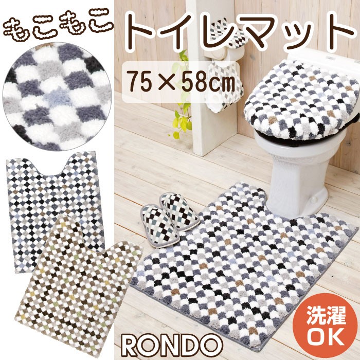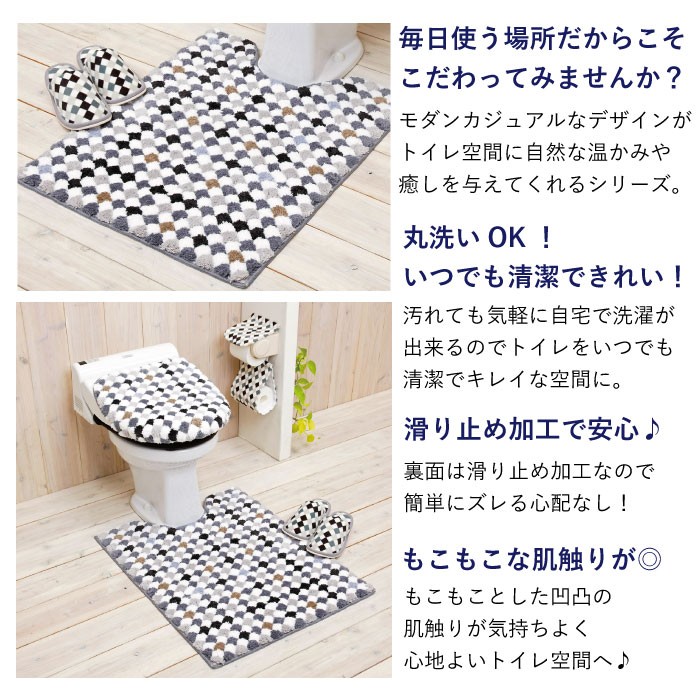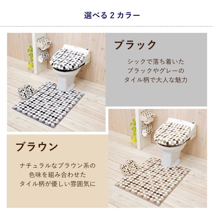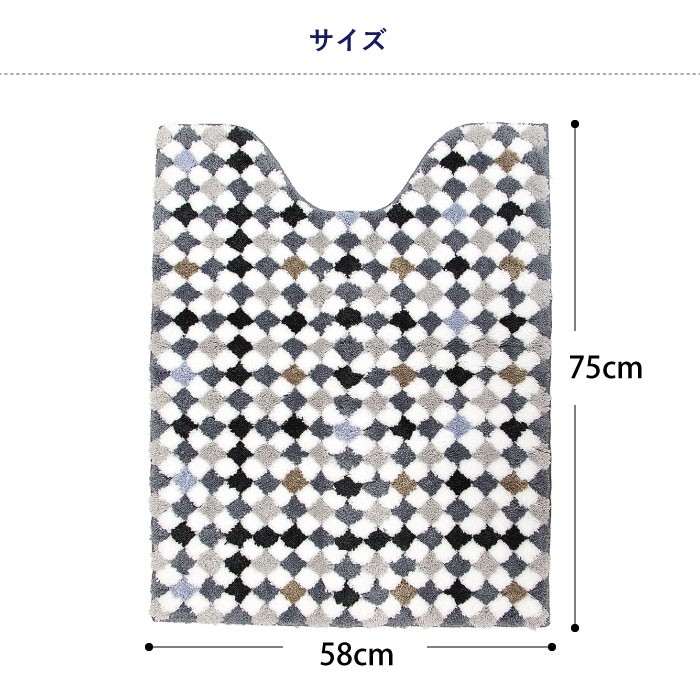 ポコポコとした肌触りの気持ちいい タイル柄のトイレマットです! ■材質 ポリエステル100% ■サイズ 約75×58cm ■特徴/仕様 トイレマットは”すべりにくい加工”済み