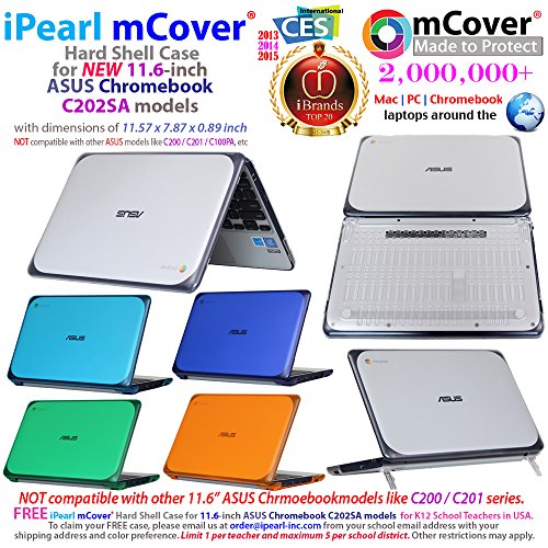 -. Binding : Electronics -. Brand : mCover® -. Color : Blue -. Feature : Made of USA-made high-quality translucent DOW polycarbonate material, which is shatter-proof and will protect your 11.6"(diagonal) ASUS Chromebook C202SA series laptop all around. / Designed to perfectly fit and protect ALL corners for the 11.6-inch ASUS Chromebook C202SA series laptop / NOT compatible with 11.6-inch ASUS C200MA / C201PA series chromebook and bigger 13.3" ASUS C300MA series Chromebook and other ASUS laptops / Designed with Retractable feet at the rear bottom to let you type more comfortably. It also helps to prolong your laptop's life with BETTER heat ventilation from features like retractable feet and more wider ventilation slots. / 2-piece light-weight (8 oz or 240 g) shell easily snaps on and off. -. Label : iPearl Inc, USA -. Manufacturer : iPearl Inc, USA -. Model : mCover-ASUS-C202SA-11.6-BLUE -. MPN : mCover-ASUS-C202SA-11.6-BLUE -. PackageQuantity : 1 -. PartNumber : mCover-ASUS-C202SA-11.6-BLUE -. ProductGroup : PC Accessory -. ProductTypeName : CARRYING_CASE_OR_BAG -. Publisher : iPearl Inc, USA -. Studio : iPearl Inc, USA -. Title : iPearl mCover Hard Shell Case for 11.6" ASUS Chromebook C202SA series laptop - Blue