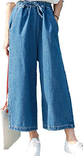 -. Title : (アイユウガ)I-YUUGAジーンズ レディース デニム ワイドパンツ ゆったり ハイウエスト 着痩せ ガウチョパンツ リボン付き 可愛い 九分丈