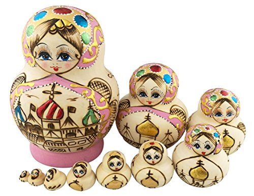-. Feature : Beautiful little girl with jewel paint on the head and the landmark of Russia,Moscow Kremlin on the middle,very attractive pattern / Contains 10 dolls with decreasing size placed one inside the other to appear as one / Big belly shape,very cute and special.All the making process is handmade / Kids will love these nesting dolls and spend time playing with them / Also is a unique decoration and a wonderful gift to any one in any occasion