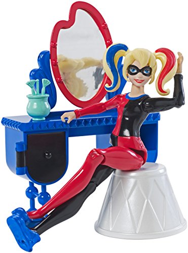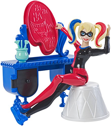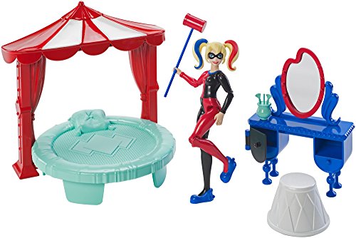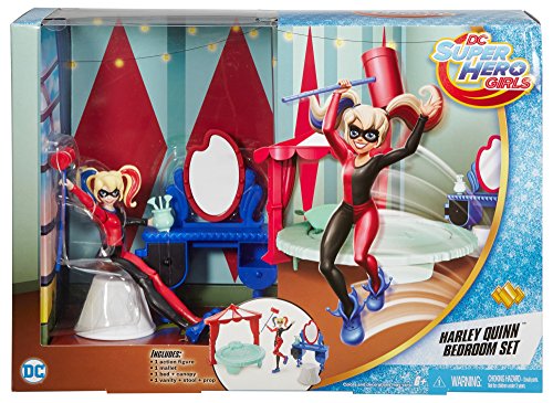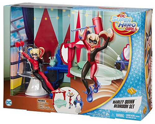 Recreate the fun of attending Super hero high with these DC Super hero girls play sets that feature a 6-inch action figure and bedroom set. Choose from sets inspired by roommates wonder Woman or Harley Quinn. Each comes with a desk accessory that has a transformation feature, a chair, a bed and a headboard with characteristic colors and details. Smaller pieces add to the storytelling fun. The action figures are ready for action-packed dreams dressed in signature pajamas with an iconic Super hero accessory.Feature