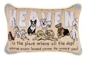 Studio : Simply Home Publisher : Simply Home Binding : Kitchen Product Description Heaven Is The Place Dogs Decorative Tapestry Toss Pillow. "HEAVEN is the place where all the dogs you've ever loved come to greet you!" Measures 9"x12". Front: 60% Cotton/40% Polyester; Back: 70% Polyester/30% Cotton; Filling: 100% Polyester; Spot or dry clean only. Made in the USA. 0