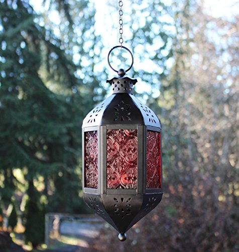 -. Binding : Kitchen -. Brand : Vela Lanterns -. Feature : Not just candlelight-these lanterns add color, pattern and an exotic global vibe to your patio or porch. / Morrocan candle lantern with colored glass. Includes chain with hook for hanging. / Uses tea-light or votive size candles only. Iron and glass. / Great for weddings, parties, indoors/outdoors and more / Candle Holder Length: 11 1/2" Tall; Chain Length: 12" Long; Overall Length: 23 1/2" Long -. IsAutographed : 0 -. MPN : SML -. PackageQuantity : 1 -. PartNumber : SML -. ProductGroup : Home -. ProductTypeName : HOME -. Title : Hanging Moroccan Candle Lantern with Chain