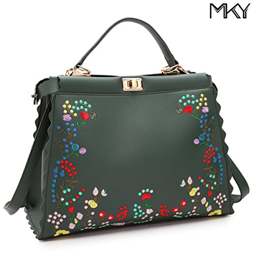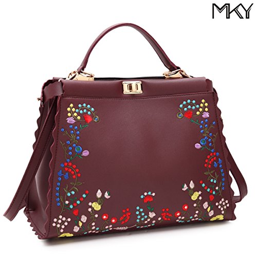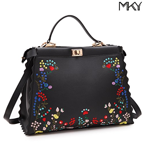 It's crafted from faux leather, uniquely designed with embroidered flower patterns,
