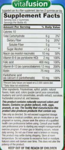 Fiber Supplement. 5 grams of fiber per serving. Now you can enjoy your fiber. Fiber is an essential part of a healthy lifestyle, but many of us don’t get enough fiber. Vitafusion Fiber Gummies Weight Management make it easy to get the extra fiber some people need, with the added benefits of B vitamins – all in a delicious sugar-free gummy. Excellent source of fiber. American Culinary ChefsBest Award winner. The ChefsBest Certified Award is awarded to brands highly rated overall by independent professional chefs. More fiber than other leading brands. Sugar free. Natural colors and flavors. Not a reduced calorie food.*These statements have not been evaluated by the Food and Drug Administration. This product is not intended to diagnose, treat, cure or prevent any disease.Feature