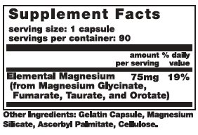 -. Feature : Directions: Recommended Use: As a dietary supplement take one capsule daily with meals or as directed by your healthcare professional. / Bottle Quantity: 90 capsules / Serving Size: 1 capsule Servings per Container: 90 / Per serving: Elemental Magnesium 75mg (from magnesium glycinate, fumarate, taurate, and orotate) / Other ingredients: Gelatin capsule, magnesium silicate, and ascorbyl palmitate.