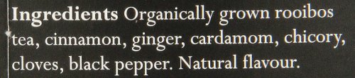 -. Feature : One, 20-count box / Dragonfly's Cape Malay Rooibos Chai is a naturally caffeine free Rooibos (red bush) tea blended with luxurious spices such as cinnamon, cardamom, ginger and cloves. / All our ingredients are organically grown and include rooibos tea, cinnamon, cardamom, ginger, chicory, cloves, black pepper and citrus peel / Infuse a sachet in freshly boiled water for 2-4 minutes / Delicious with or without milk or as an iced tea; sweeten with sugar or honey to taste