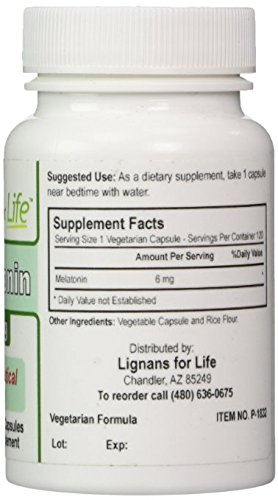 -. Binding : Health and Beauty -. Brand : Lignans For Life -. EAN : 0857341051006 -. Feature : Melatonin 6mg / 120 vegetarian capsules / Sleep Aid for People / May Help Ease Symp of Cushing's in Dogs -. IsAdultProduct : 0 -. Label : Lignans For Life -. Manufacturer : Lignans For Life -. Model : 6 mg melatonin -. MPN : Mel6CDA -. NumberOfItems : 147 -. PackageQuantity : 1 -. PartNumber : Mel6CDA -. ProductGroup : Health and Beauty -. ProductTypeName : HEALTH_PERSONAL_CARE -. Publisher : Lignans For Life -. Studio : Lignans For Life -. Title : Melatonin 6 mg 120 Capsules -. UPC : 857341051006
