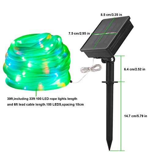 - Solar Powered Rope Light: 100 LED rope light is 33ft length(6.5ft lead cable included).Solar panel(0.5W/150MA) with built-in 1.2V 1000mAH AA size Ni-Mh battery.