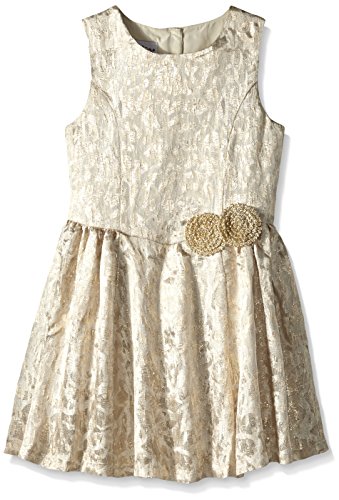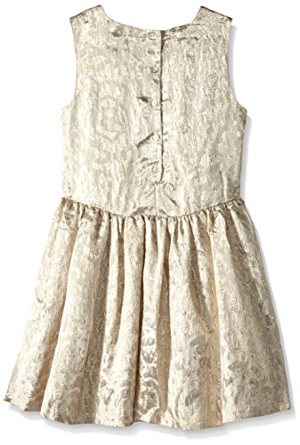 This gorgeous lightweight gold brocade dress has a V-shaped bodice and sweet embellishment at the waistline