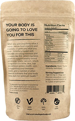 -. Feature : INCREASED ENERGY, MOOD, MENTAL PERFORMANCE & MEMORY - Hydrilla Verticillata green superfood powder is loaded with a full spectrum of B Vitamins, especially the hard to get Vitamin B12, which are critical for healthy energy levels, positive mood, brain function and all around nervous system health and functioning. / GET THE NUTRITION OF 2 POUNDS OF VEGETABLES IN EVERY TEASPOON - Hydrilla Verticillata is a powerful, nutrient-dense, whole green superfood with extraordinarily high levels of the essential nutrients your body needs every day to thrive. Each teaspoon of Hydrilla is on average nutritionally equivalent to eating two pounds of vegetables and greens. Supplement the missing nutrients in your diet with with this powerful whole food. / LOADED WITH WHOLE FOOD VITAMINS, MINERALS, ANTIOXIDANTS AND MORE - The naturally occurring whole food nutrients in Hydrilla Verticillata are completely bioavailable, meaning your body can fully utilize them to meet its daily needs-unlike synthetic vitamin and mineral supplements, which are poorly absorbed. / HIGH IN CALCIUM - SUPPORTS IMMUNE, BONE, HAIR AND SKIN HEALTH - Hydrilla Verticillata contains more Calcium than any other food on the planet and is rich in many different minerals, vitamins and antioxidants that have been shown in numerous studies to be important for immune system health, detoxification and strengthening of bones, hair skin and nails, making it one of the planet's elite superfoods. / 100% PURE GREEN SUPERFOOD | VEGAN | RAW | GLUTEN FREE | WILDCRAFTED - Our Hydrilla Verticillata superfood powder is 100% pure, US grown/wildcrafted and low temperature dried to preserve delicate natural nutrients in the plant. Plus, Hydrilla has a mild earthy taste and has tested free of heavy metals, chemicals, pesticides, etc.
