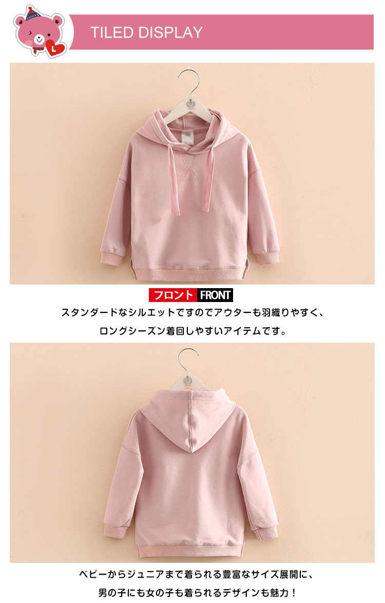 | カジュアルの定番、ベーシックなぷるパーカー。スタンダードなシルエットですのでアウターも羽織りやすく、ロングシーズン着回しやすいアイテムです。ベビーからジュニアまで着られる豊富なサイズ展開に、男の子にも女の子も着られるデザインも魅力! | |