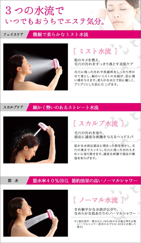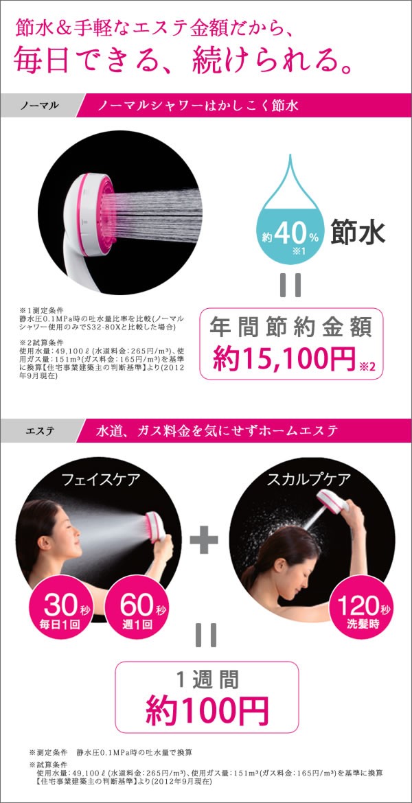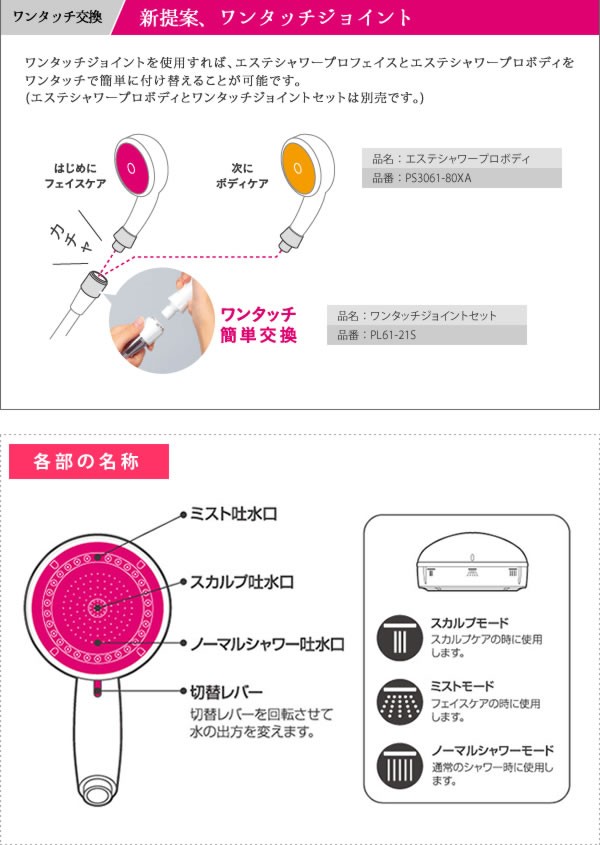 | 付属品 | アダプター×2個、取扱説明書、シャワーエステレシピ×3枚、シャワーエステレシピDVD |