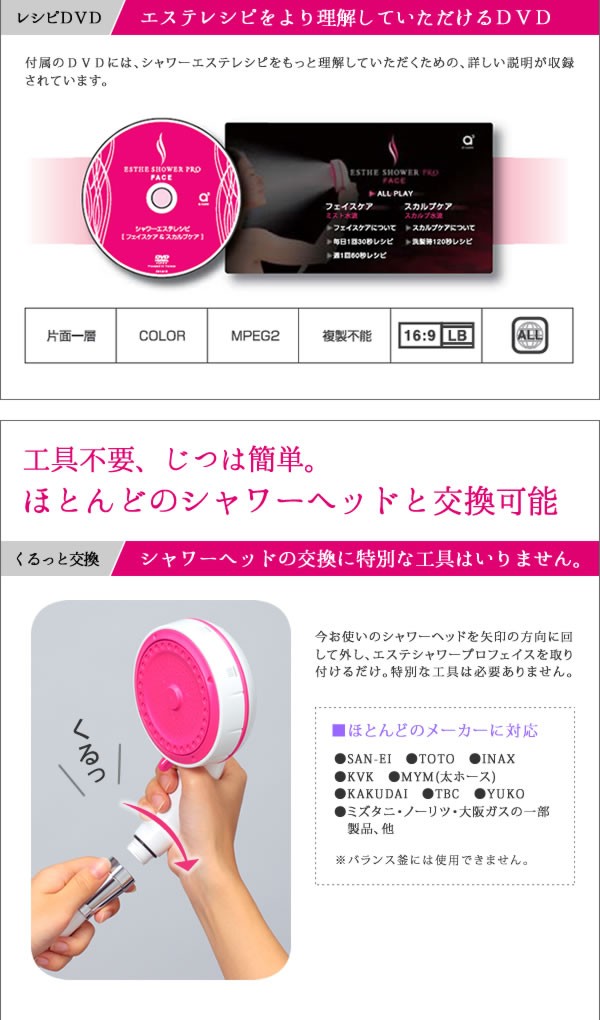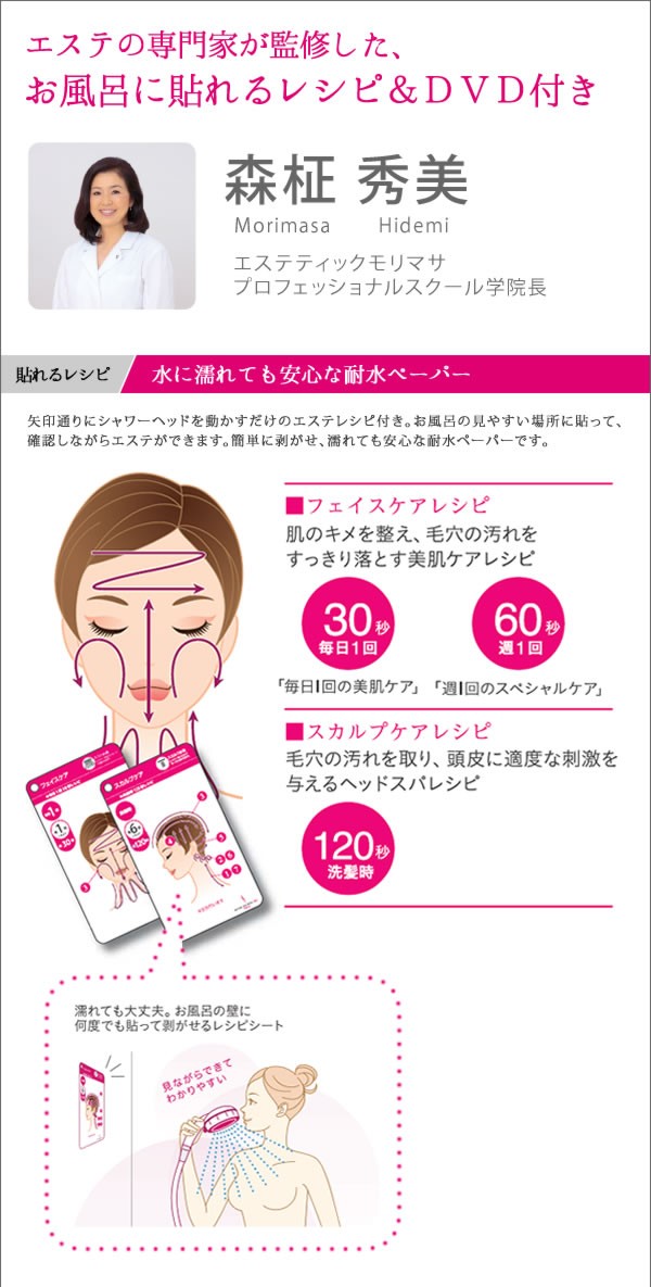 | <h1>おうちのお風呂で美肌ケアとスカルプケアができるシャワーヘッドです。エステティシャンのハンドテクニックをもとに独自の水流を開発しました。エステの専門家が監修した、お風呂に貼れるシャワーエステレシピ&DVD付き!!</h1> |