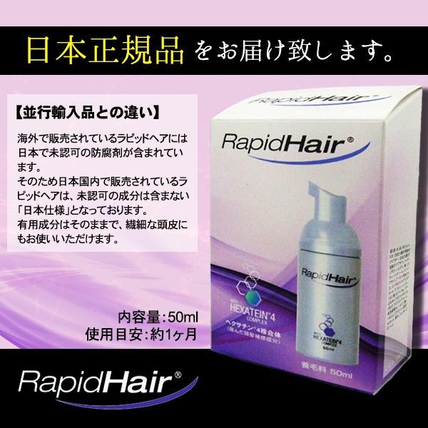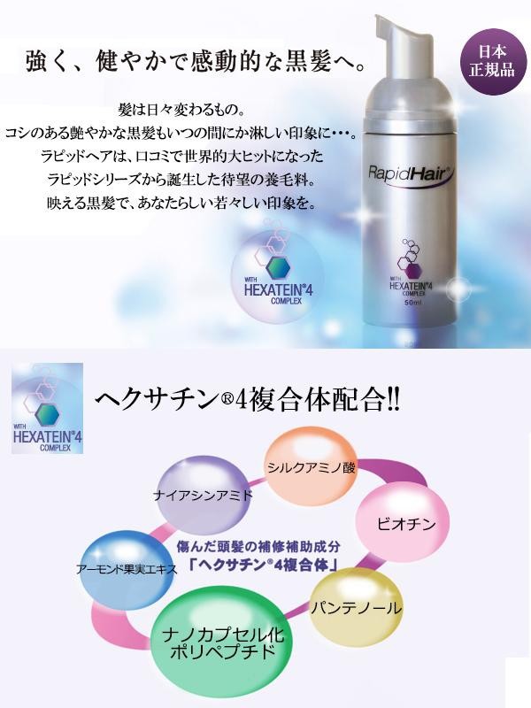 ラピッドヘアはメーカー独自の「ヘクサチン(R)4複合体」を含んだ頭髪および頭皮用の養毛料です。洗髪後、頭皮に直接塗布し、マッサージをするだけの楽々ケア♪男性でも女性でもご使用いただけます。パラベン不使用。 |