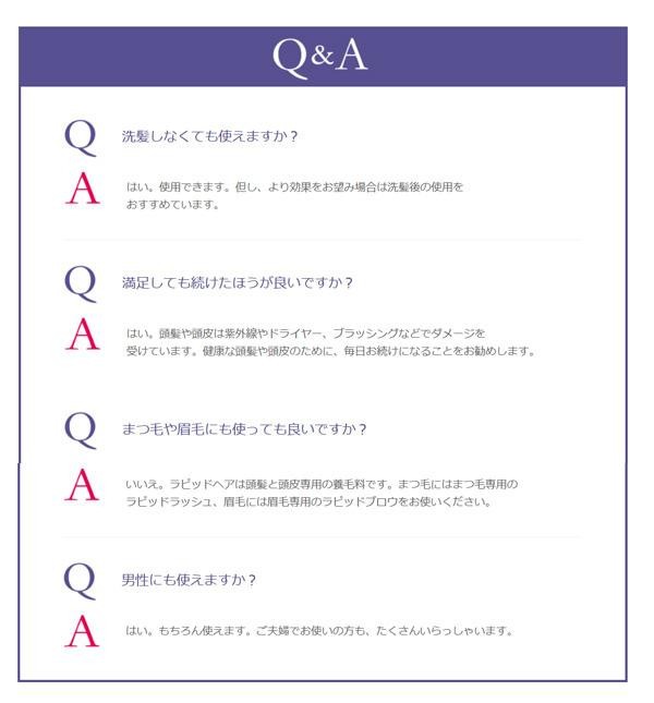 | ラピッドヘアはメーカー独自の「ヘクサチン(R)4複合体」を含んだ頭髪および頭皮用の養毛料です。洗髪後、頭皮に直接塗布し、マッサージをするだけの楽々ケア♪男性でも女性でもご使用いただけます。パラベン不使用。 |