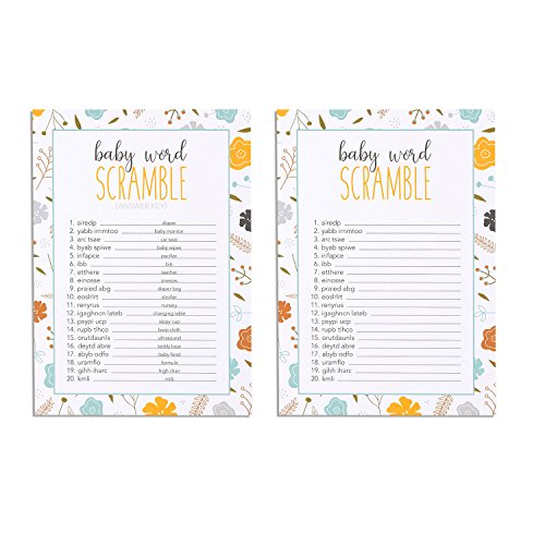 - GAMES AND PHOTO PROPS: The baby word game scramble features 32 sheets including 2 sheets printed with answers. The photo booth props come with 24 wooden sticks and 24 clear stickers for simple assembly. Simply attach the photo booth props to the sticks with the included clear stickers. Add glue (not included) to reinforce hold.