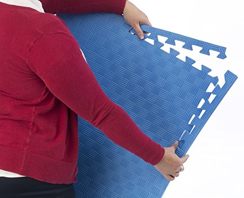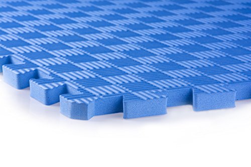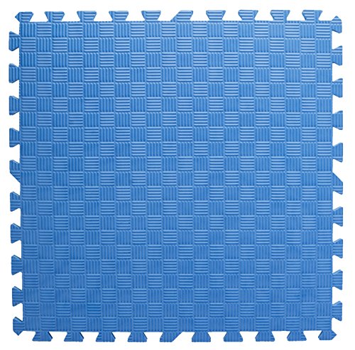 These blue puzzle piece tiles interlock together to make a 6'x8' rectangle (with 1 piece extra). Customers can purchase 2 sets of 26 pieces total to make a 10'x10' floor. Each mat piece is made of EVA foam - an anti-fatigue, non-toxic, stain resistant, and durable material. Use these 2'x2' jigsaw pieces in a playroom, daycare, yoga studio, or tradeshow. Dimensions Per Piece: 24"w x 24"d x.5"h.
