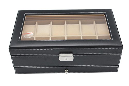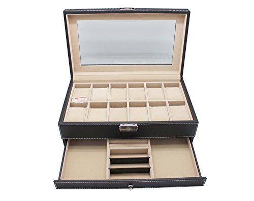 Studio : eHomeProducts Publisher : eHomeProducts Binding : Kitchen Product Description This Black Faux Leather 12 Slots Watch Storage Box Men Organizer Lockable Jewelry Display Case with Glass Top is a great addition to your watch and storage needs. Features 12 watch slots with removable velvet pillows, 1 ring case, 2 stud earring cards, 5 more compartments for necklaces, earrings, bracelets, cufflinks, brooches and other jewelry. Also, comes with Glass lid top that showcases your watches openly. Measures 5.25 inches high x 12.75 inches wide x 7.75 inches deep. 0