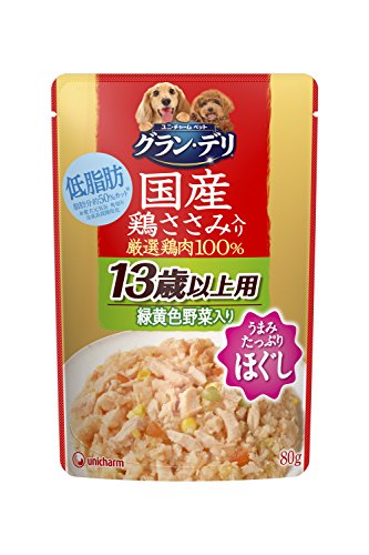 原材料:肉類(鶏胸肉、鶏ミンチ、鶏ササミ)、野菜類(ニンジン、グリンピース、トウモロコシ)、しょうゆ、増粘多糖類、塩化カリウム、酸化防止剤(EDTA-Ca・Na)、ビタミン類(B1、B2、B6、B12、C、E)、グルコサミン、コンドロイチン