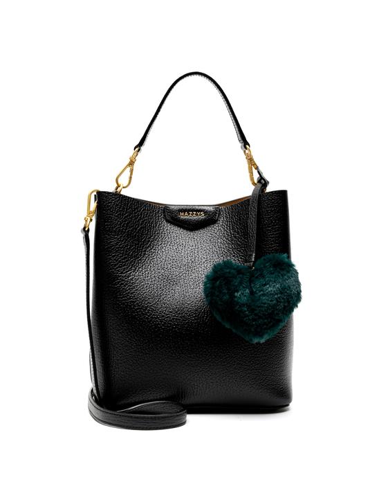 블랙 컬러 바탕에 베이직한 디자인으로 그린 하트퍼 장식과 HAZZYS 골드 로고로 포인트를 준 버켓백 입니다.