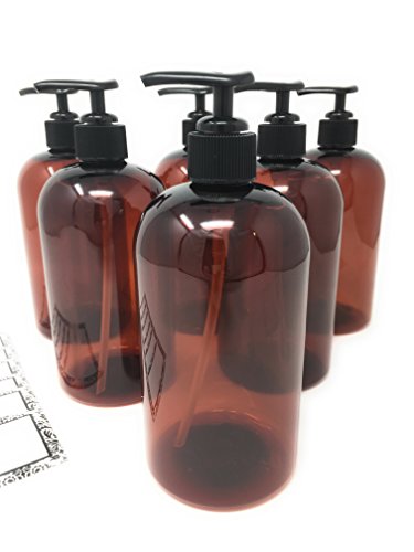 BROWN AMBER PLASTIC PUMP BAIRE BOTTLES, 16 OZ REFILLABLE with Black Pumps - PET, Lightweight, Leakproof, BPA Free - 6 Pack, BONUS 6 DAMASK LABELS