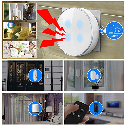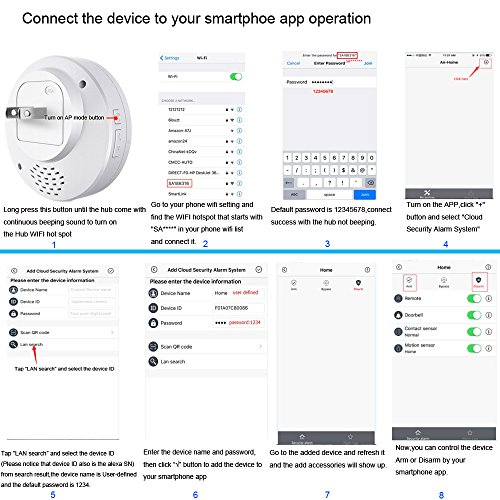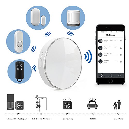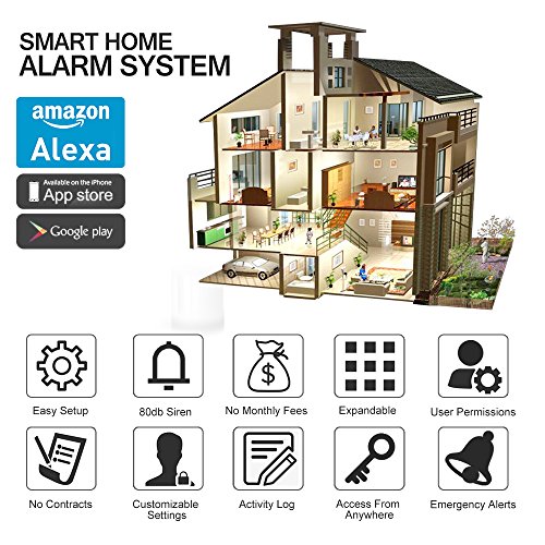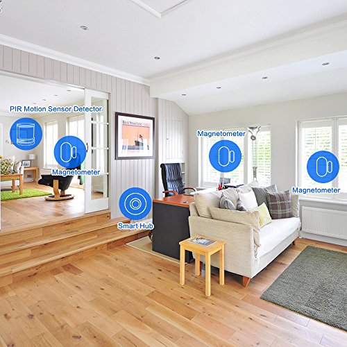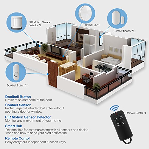 -. Feature : Wireless Control:There are three options to you to control the device:mini remote control,smartphone app control and Works with Amazon Alexa for voice control(Alexa device sold separately) / WIFI-enabled cloud security alarm system, with 1 smart wifi hub, 5 contact sensors, 2 motion sensors, 1 doorbell button for you to control and monitor your home security anytime anywhere / Easy to install: We have made all accessories paired with the hub before leaving our company,just remove the insulting strip before using is fine.The window/door sensor can be installed on doors,windows and any other objects that can open and close.The sensor transmits signal to control panel when a magnet mounted near the sensor is moved away.The mini motion sensor can detect human movement within the 6-meter cone space,suitable or halls,hallways,etc / Expandable:Our 1 Smart hub can add up to 50 wireless accessories,you can add more contact sensors or motion sensors as you like / This is a 2.4Ghz supported security alarm system and it does not support 5Ghz networks. Kindly refer the User Manual before use.Easy setup with your IOS or android smartphone. DIY home security,no contracts no monthly monitoring fee.Tool-free setup and assembling