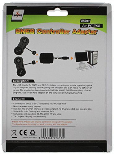 Studio : Mayflash Publisher : Mayflash Platform : Nintendo Super NES Binding : Accessory Product Description Connects up to two controller to your computer (PCs only). No extra drivers required, nothing extra needed, just plug and play. Suitable for both notebooks and desktop PCs. Compatible with Windows 98, ME, 2000, 2003, XP and Vista. Super sensitive buttons for precision control. Yo can use two or more controllers for multi-player gaming. Standard HID (Human Interface Device) compliant. Please use original controllers with this adapter. Third party controllers may not work properly with this adapter. 0