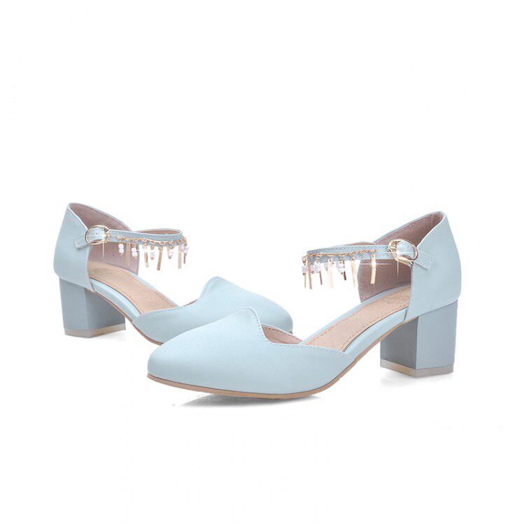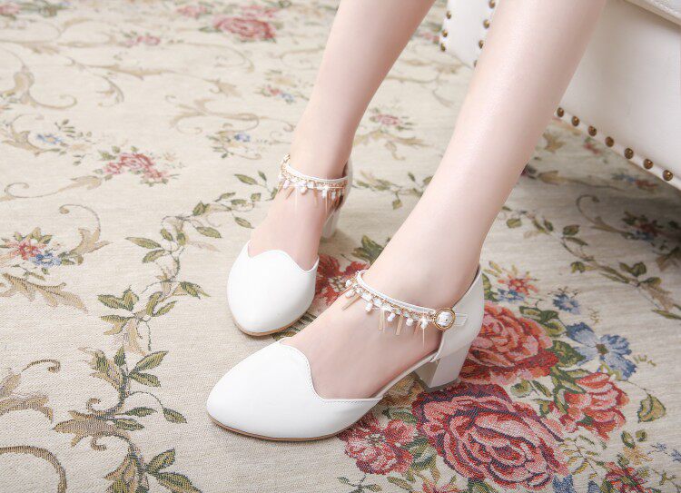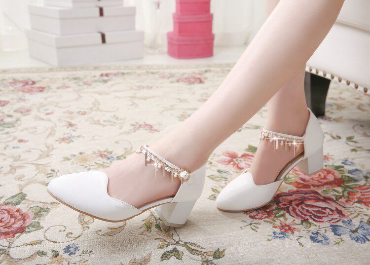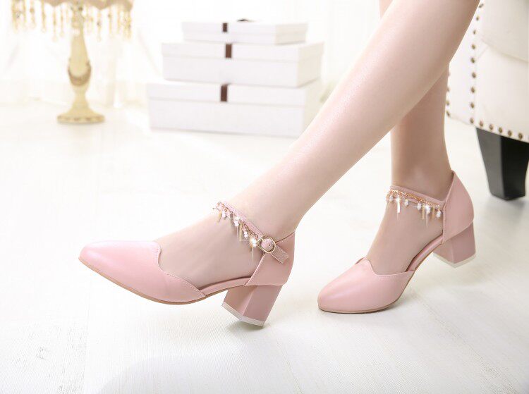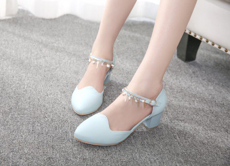 新款甜美公主粗跟凉鞋中跟尖头鞋子包头浅口水钻搭扣大码女鞋