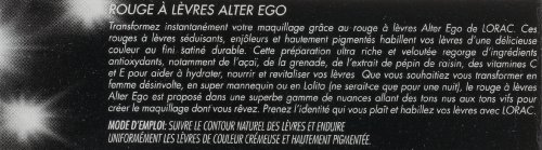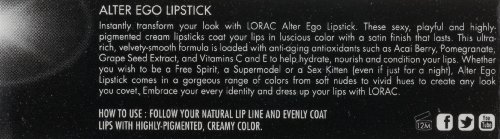 Instantly transform your look with LORAC Alter Ego Lipstick. These sexy and playful lipsticks coat your lips in highly-pigmented color with an opaque, matte finish. Alter Ego Lipstick contains antioxidants such as Acai Berry, Pomegranate, Grape Seed Extract, and Vitamins C and E. Whether you wish to be a Free Spirit, a Supermodel or a Sex Kitten (even if just for a night), Alter Ego Lipstick comes in a gorgeous range of colors from soft nudes to vivid hues to create any look you covet. Embrace your every identity and dress up your lips with LORAC.Feature