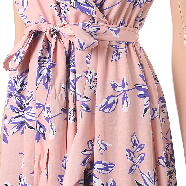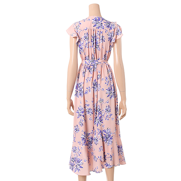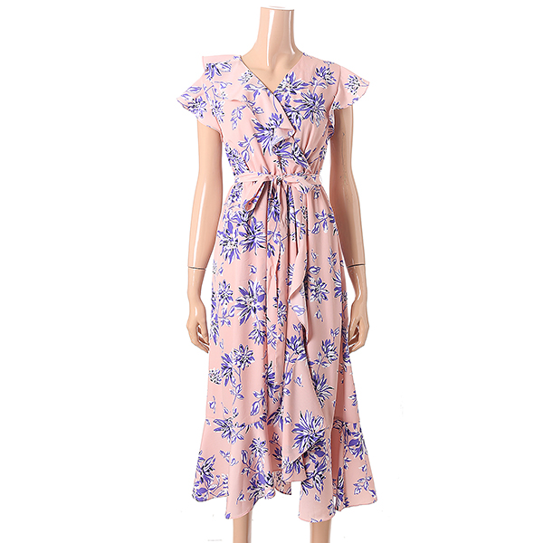핑크 컬러에 빅 플라워 패턴과 러플 장식으로 포인트를 준 롱 원피스 입니다. 허리밴딩으로 편안하며 리본 벨트 디테일로 다양한 분위기를 연출해 줍니다.