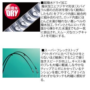 전아이템에 언더100g이라고 하는,다이와 인터 라인 에기《구롯도》사상최 경량(2015년 7월 시점)를 달성하고, 안쪽에는 부드러운 라인 방출을 가능하게 한다「초발수DRY」가공,이삭 끝(칼·창·송곳·붓 등의 끝)에는 몇 안 되는 에기의 변화도 놓치지 않는 슈퍼 플렉스 톱을 탑재.…