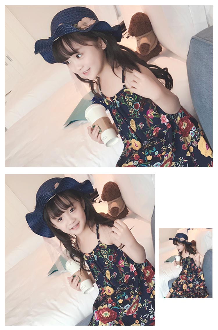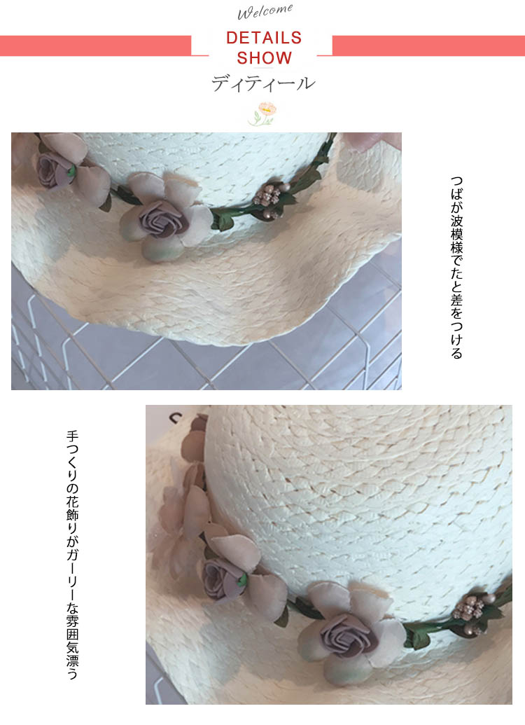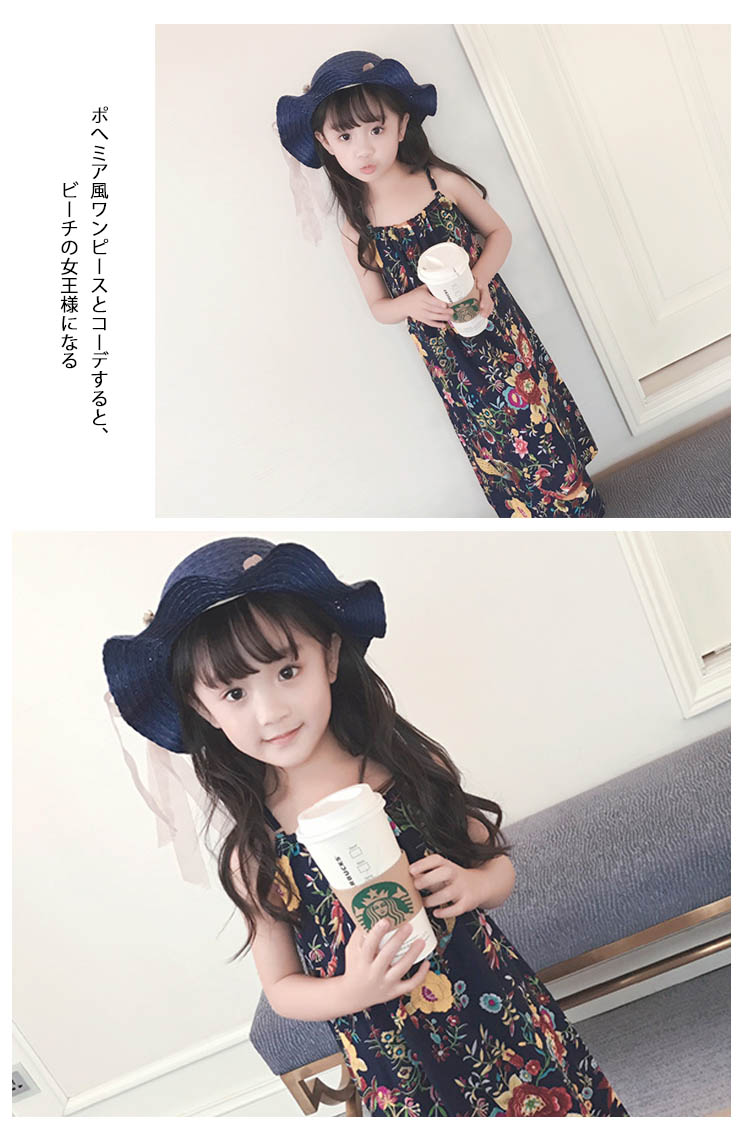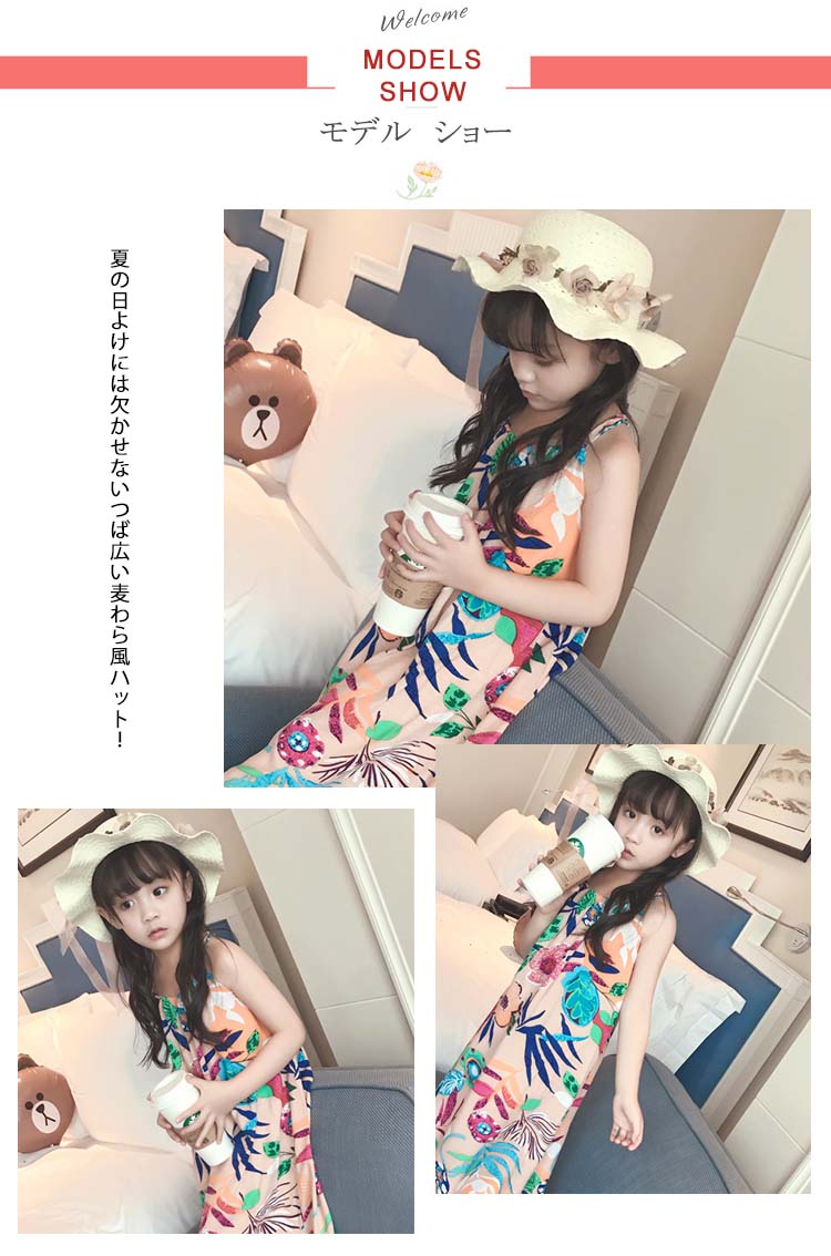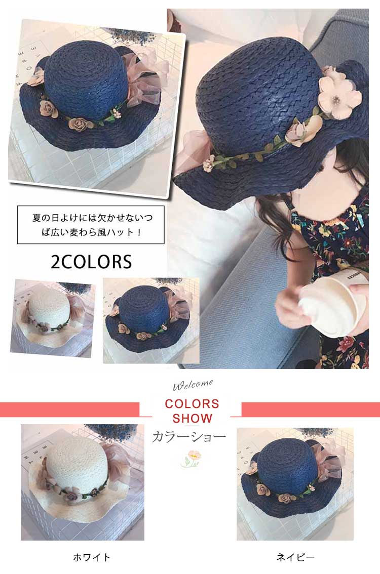 | 夏の日よけには欠かせないつば広い麦わら風ハット!花モチーフとリボン付きでカーリーな着こなしに広いつばですので、日差し対策として顔や首をきちんと守るポへミア風ワンピースとコーデすると、ビーチの女王様になる | |